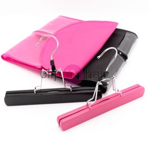A simple and practical hair case with a wooden hanger that is suitable for travel and home hair organization.